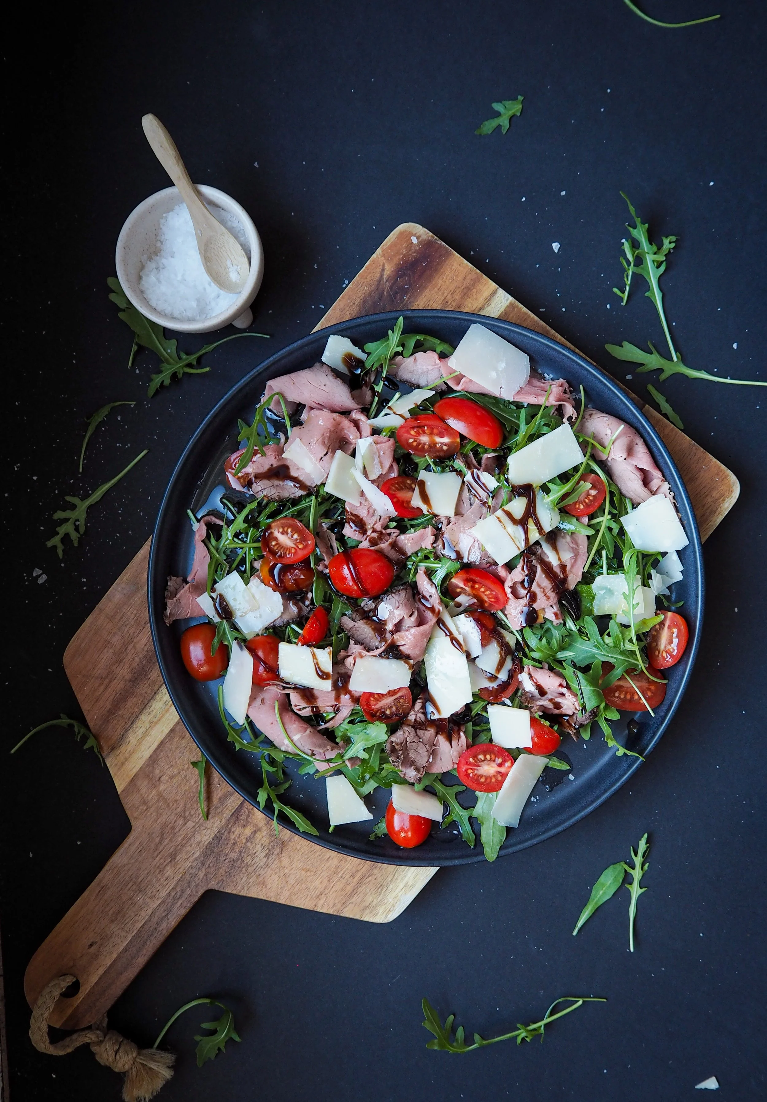 Nydelig, enkel italiensk salat laget på få minutter! I sommer var jeg i Italia, og det første måltidet jeg hadde var dette: Roastbiff, ruccola, parmasan, tomater, olivenolje og balsamico. MEd en så enkel ingrediensliste var jeg redd jeg gikk en kjedelig lunsj i møte, men dette var helt nydelig!