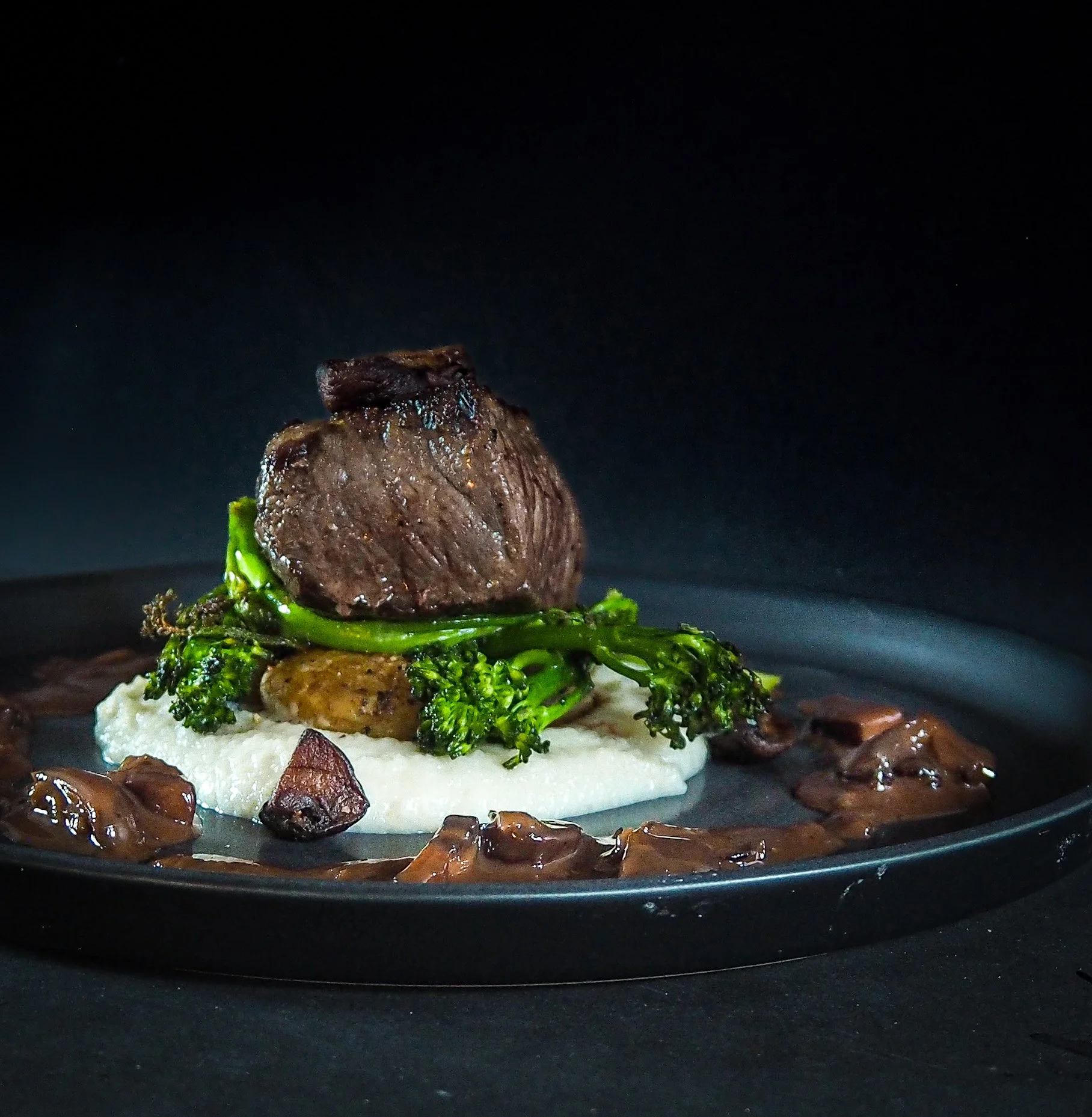 Stek så biffene først på høy varme med salt og peppper på i olje. Skru så ned varmen til middels, tilsett et knust hvitløksfedd om du har og smør. Tilsett så brokkolini i samme panne siste 4 minuttene.