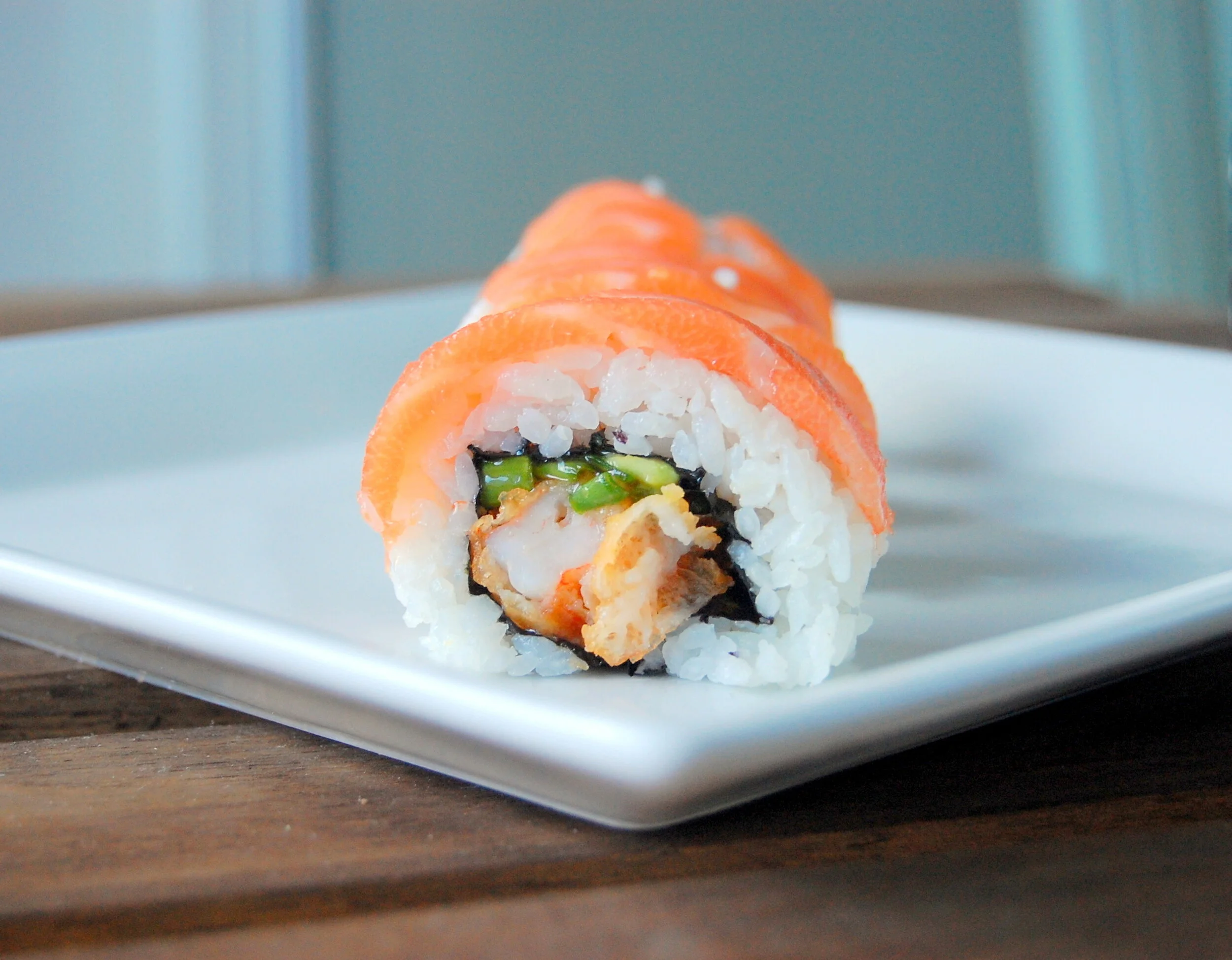 Tredje sushioppskrift ut, er tempura scampi maki; frityrstekt scampi toppet med laks i min versjon. Jeg har lenge forsvart mitt store sushikonsum med at det jo tross alt er fisk og dermed så sunt som bare det. Det begynner vel å bli en sannhet med modifikasjoner når tempura innføres på menyen, som jo kort og godt vil si frityrstekt sjømat, men tempura er så digg at det får bare være!